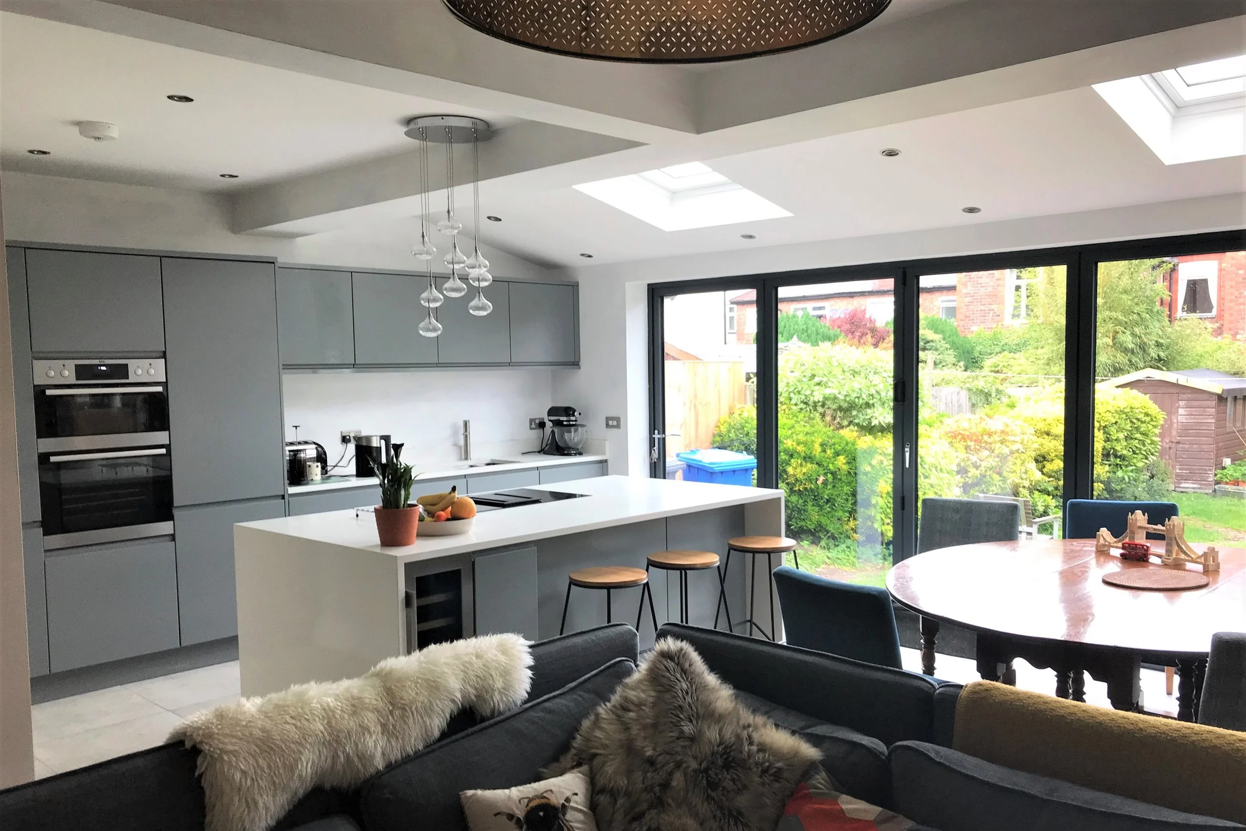 The single-storey rear and side extension on a fairly tight site in South Warrington was quite limiting but a very careful space planning and some large pieces of steel made it all happen. Not only did it provide the desired large family space, but it also managed to accommodate a separate utility room and a downstairs WC. Five metres long bi-folding doors now also connect and integrate the garden space into the internal living area.